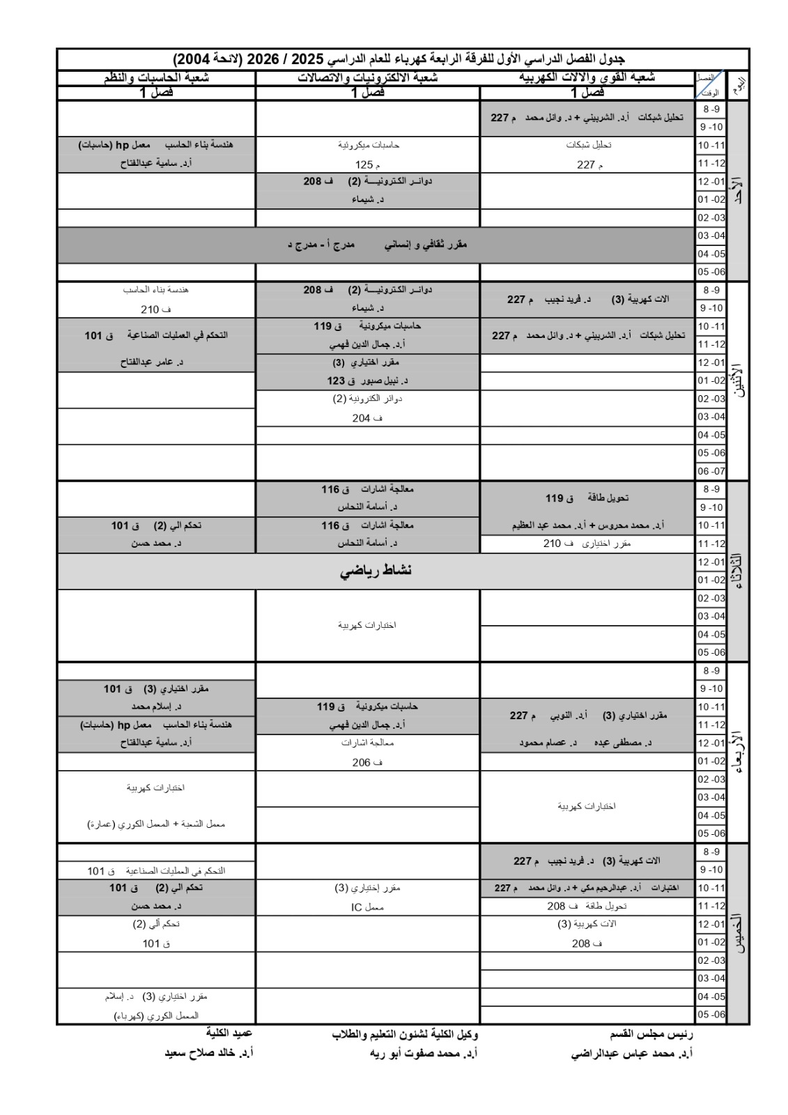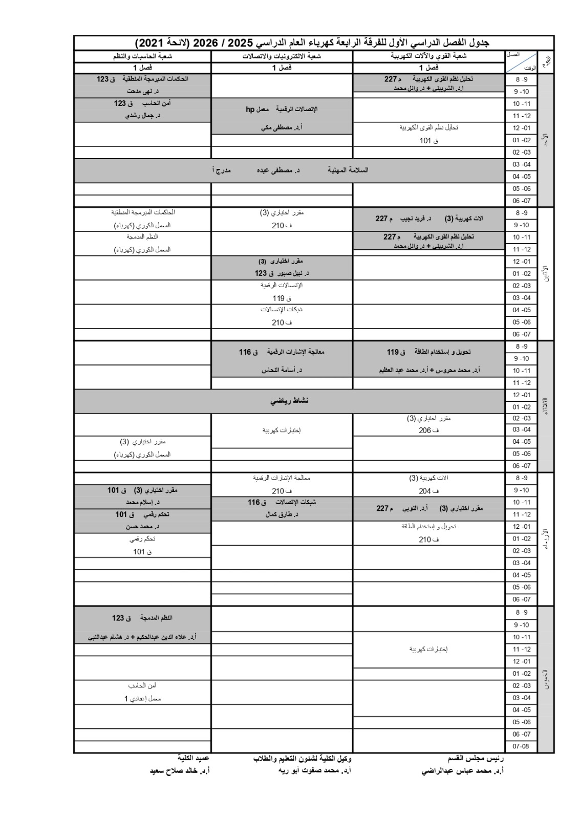 جدول الفرقة الرابعة هندسة الكهرباء للفصل الدراسي الأول للعام الجامعي 2025/2026م