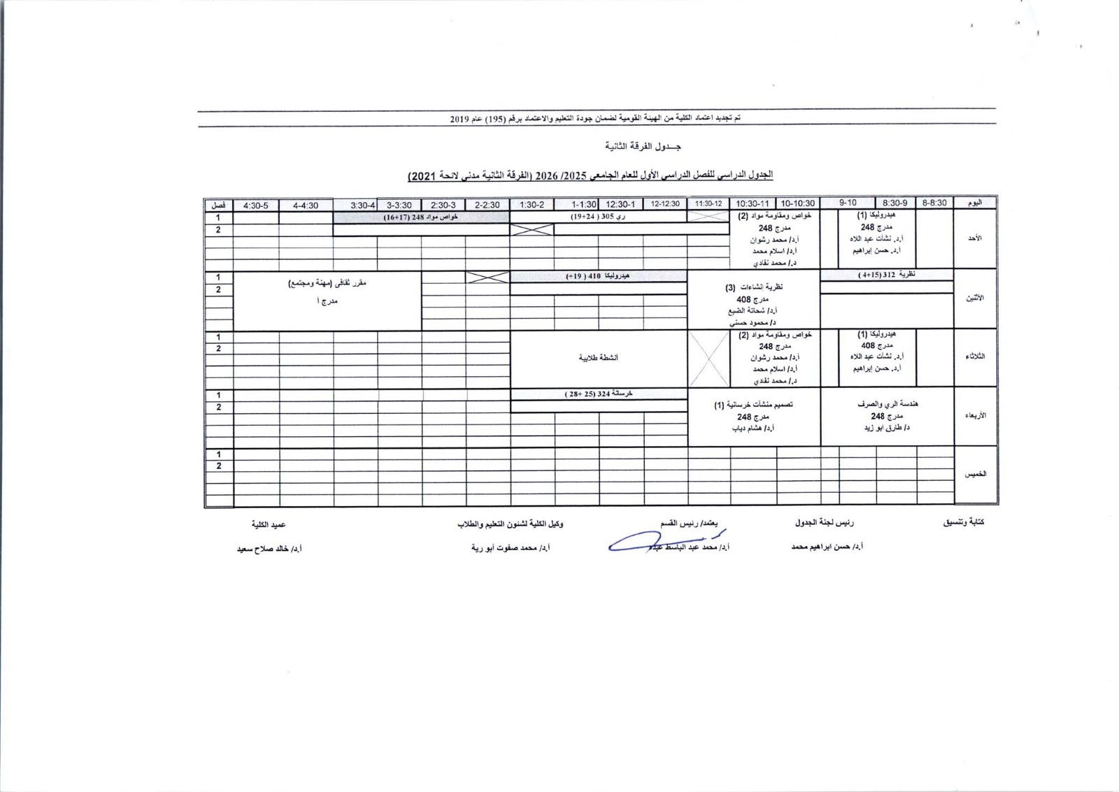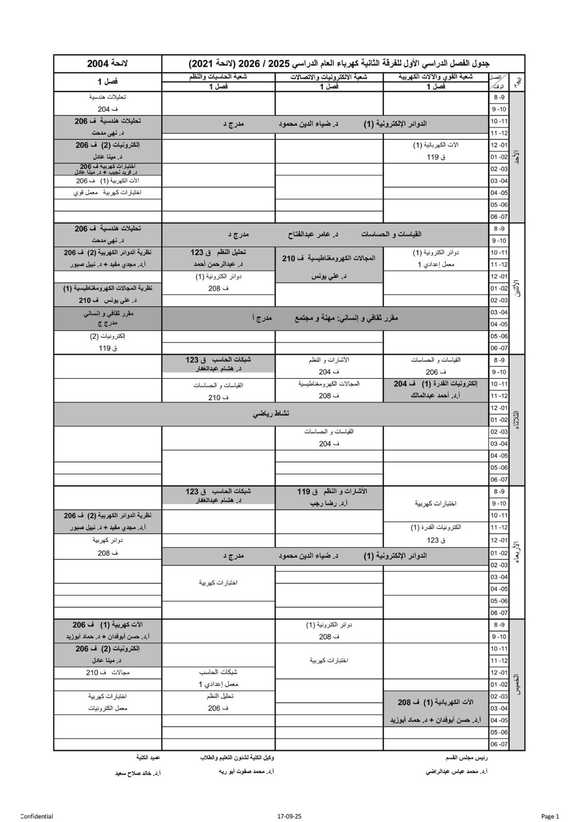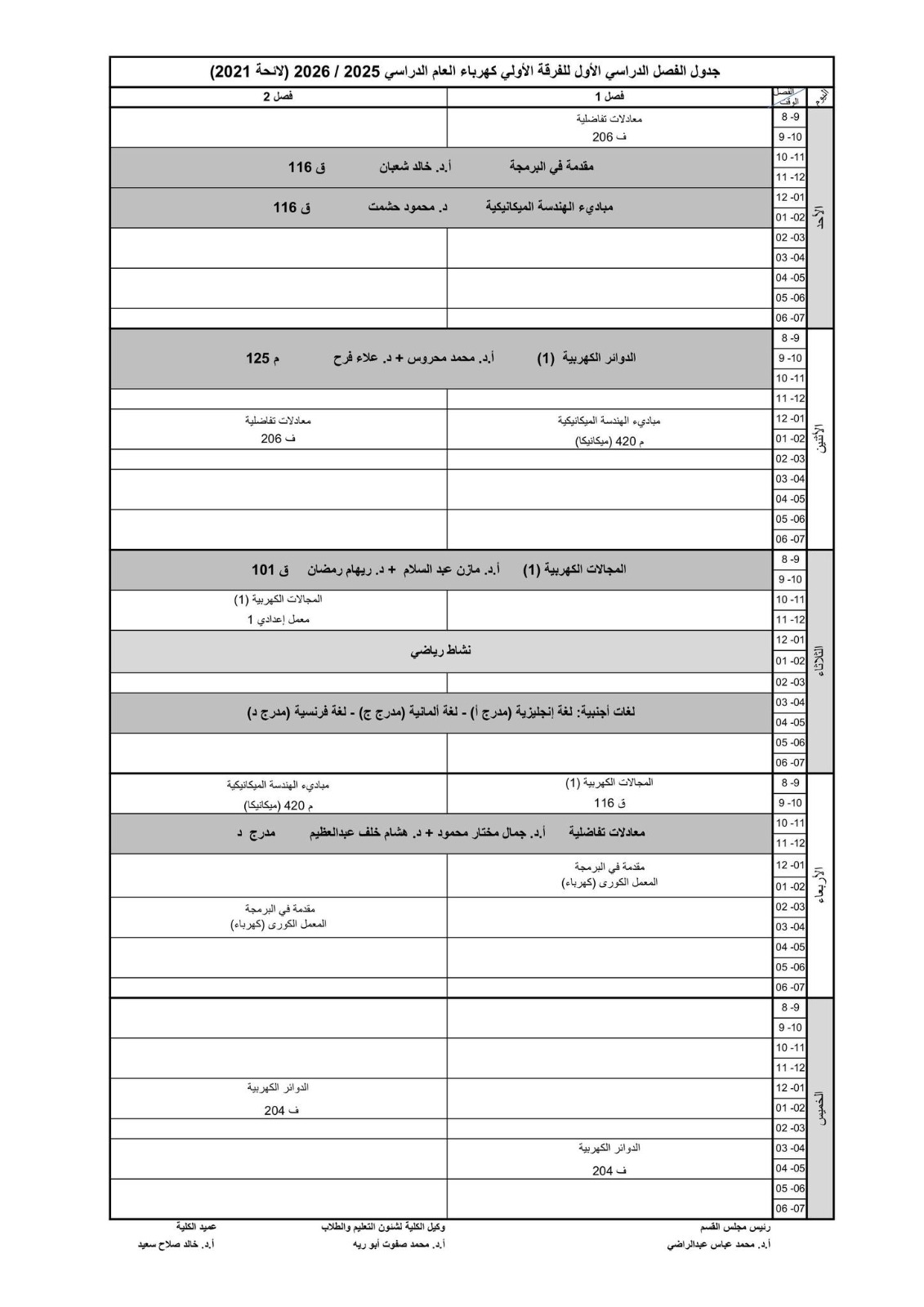جدول الفرقة الثانية هندسة الكهرباء للفصل الدراسي الأول للعام الجامعي 2025/2026م