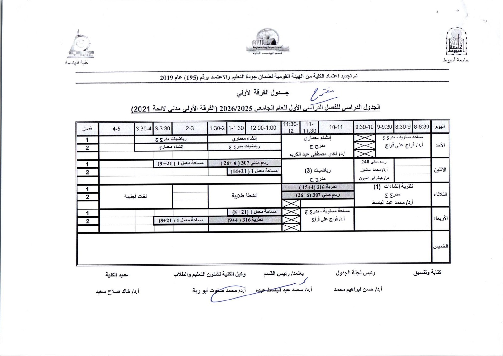 جدول قسم الهندسة المدنية الفرقة الأولى للفصل الدراسي الأول للعام الجامعي 2025/2026م