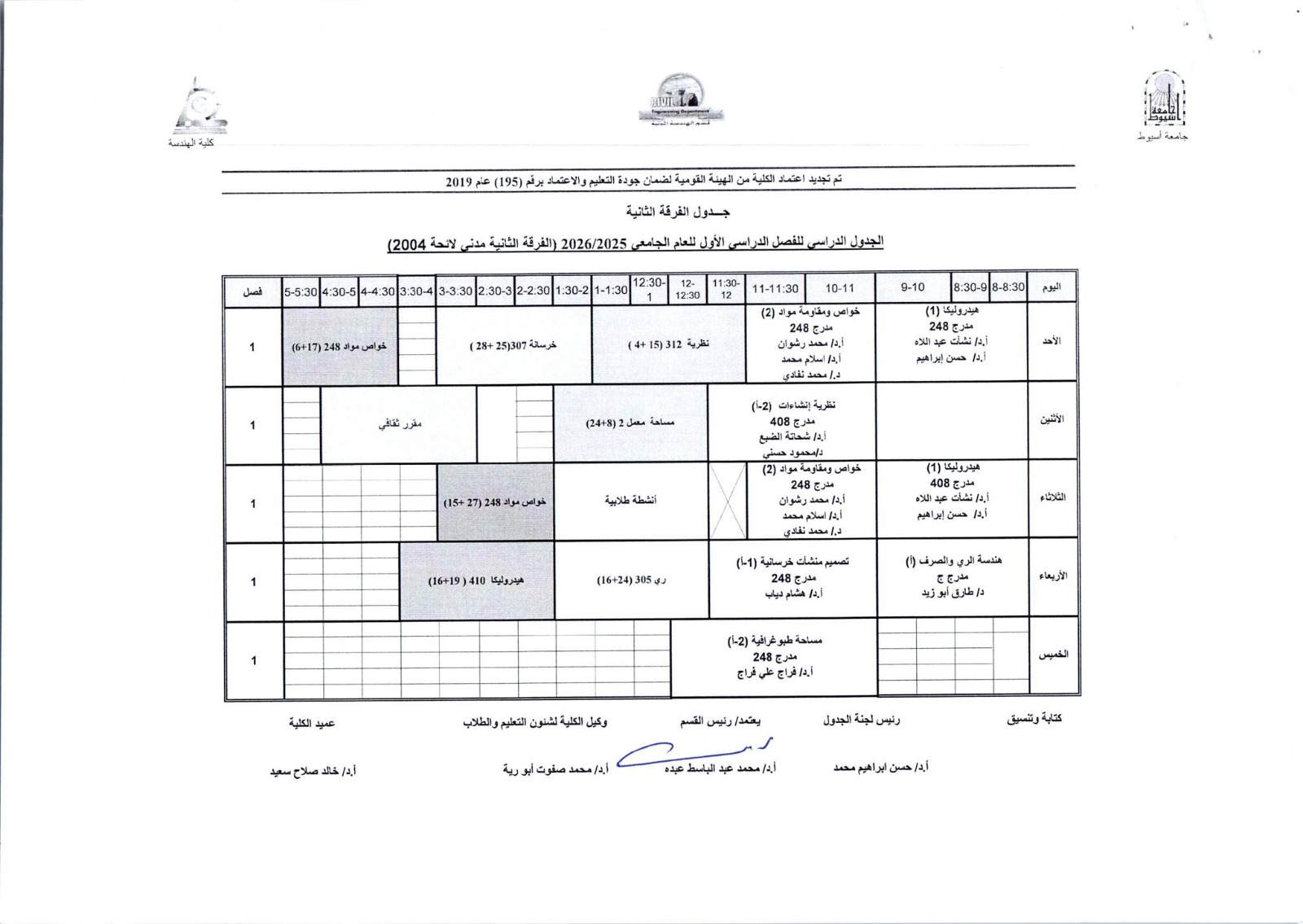 جدول قسم الهندسة المدنية الفرقة الثانية للفصل الدراسي الأول للعام الجامعي 2025/2026م