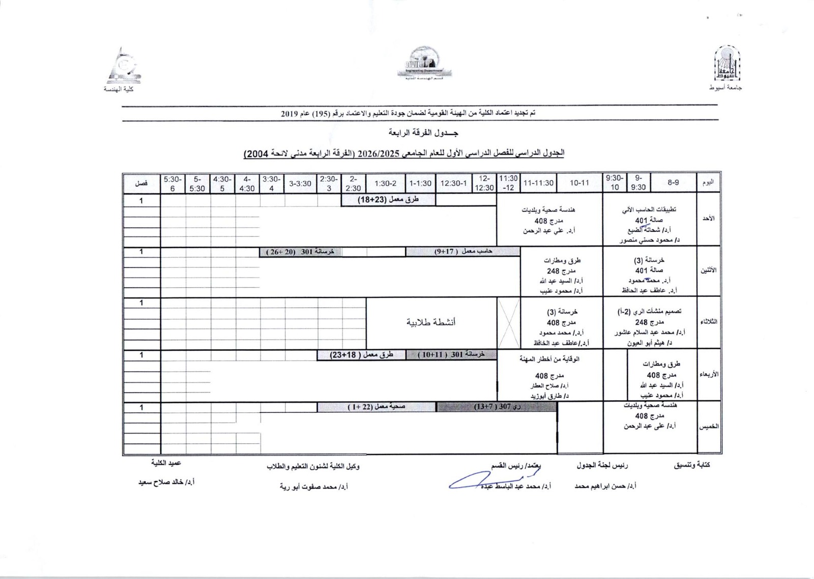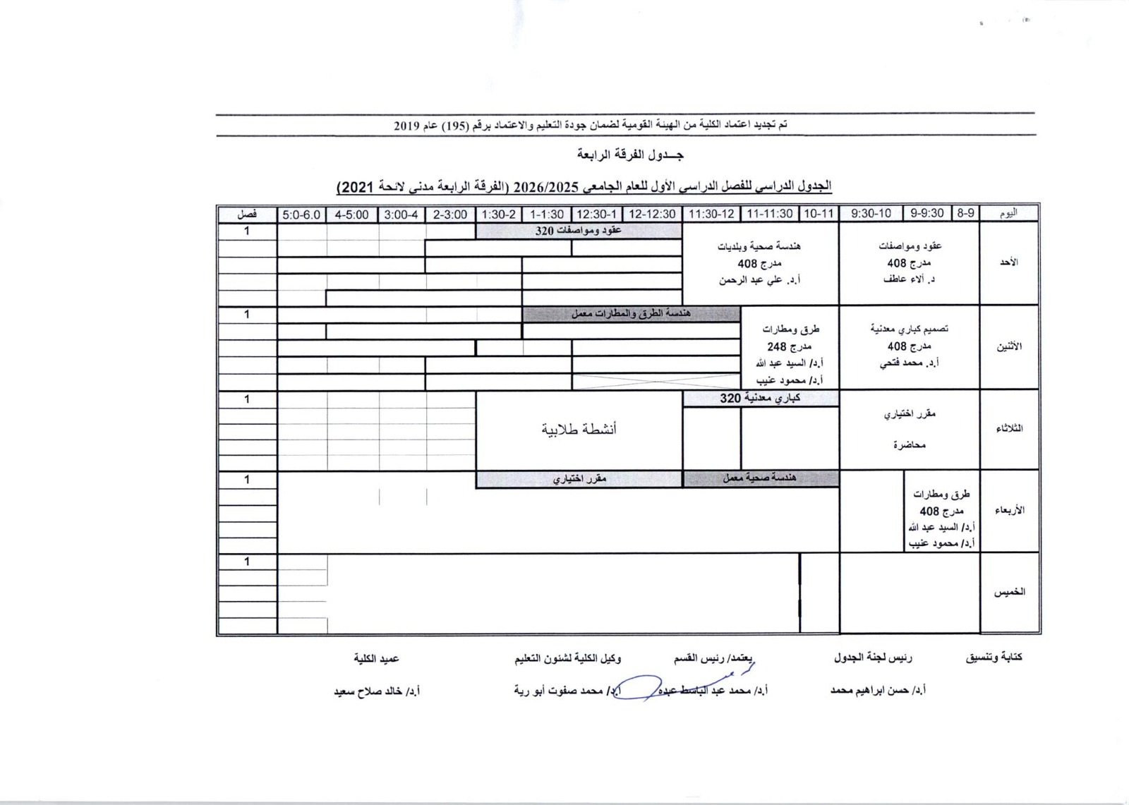جدول قسم الهندسة المدنية الفرقة الرابعة للفصل الدراسي الأول للعام الجامعي 2025/2026م