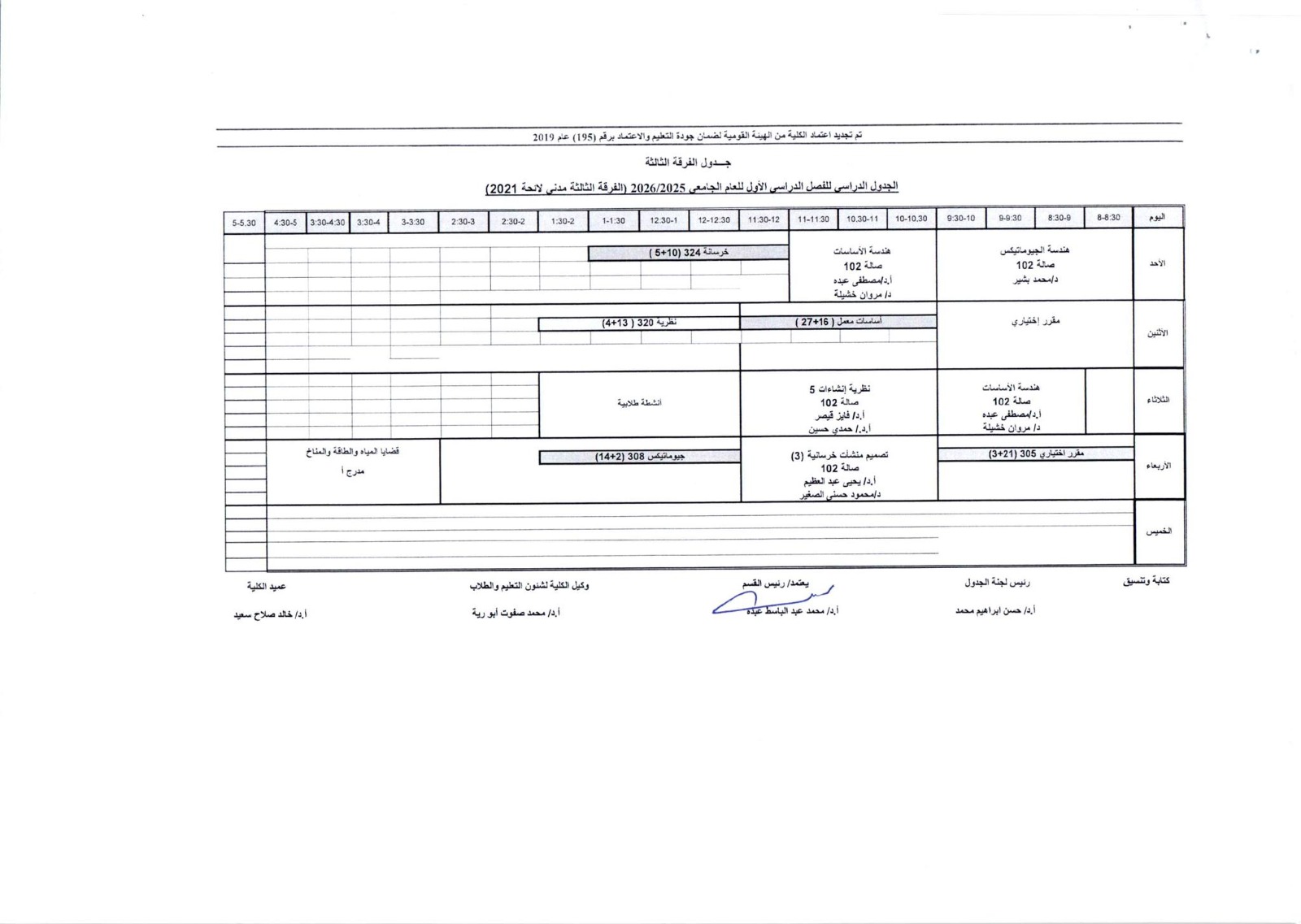جدول الفرقة الثالثة أقسام الهندسة الميكانيكية للفصل الدراسي الأول للعام الجامعي 2025/2026م