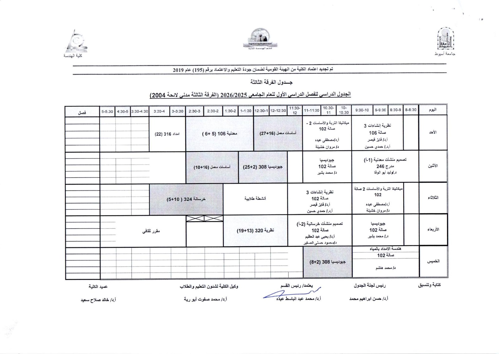 جدول قسم الهندسة المدنية الفرقة الثالثة للفصل الدراسي الأول للعام الجامعي 2025/2026م