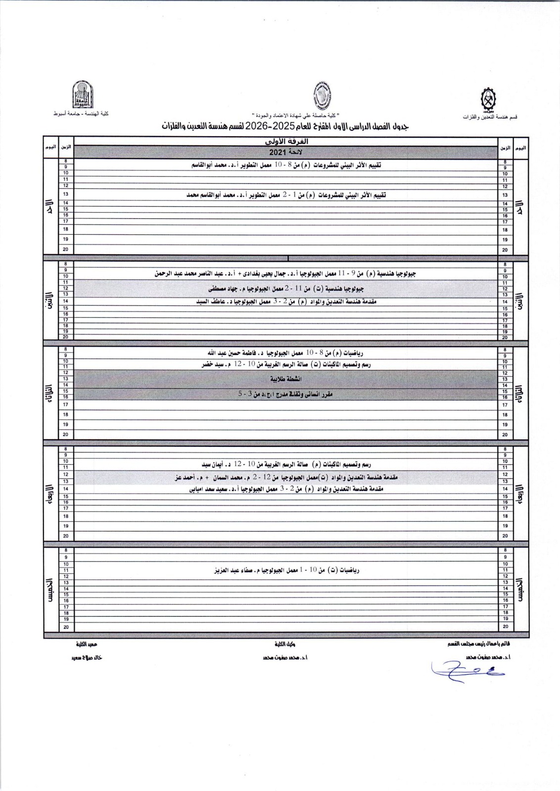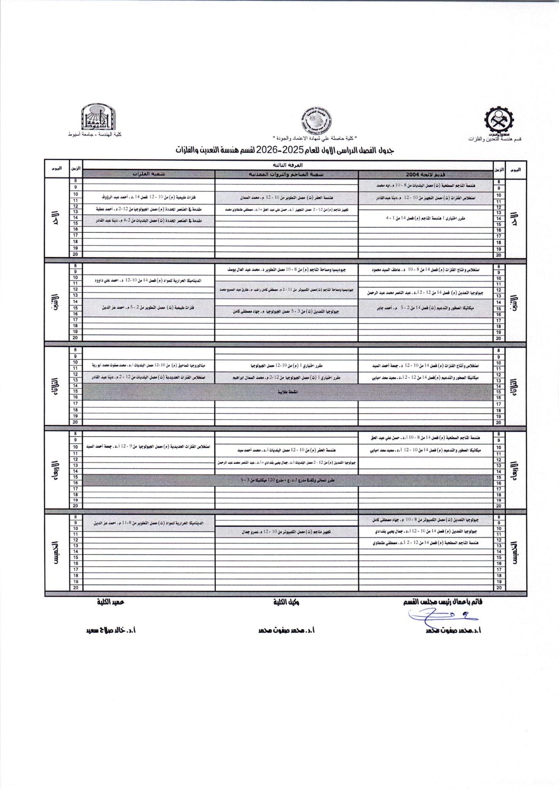 جدول قسم هندسة التعدين والفلزات الفرقة الأولى للفصل الدراسي الأول للعام الجامعي 2025-2026م