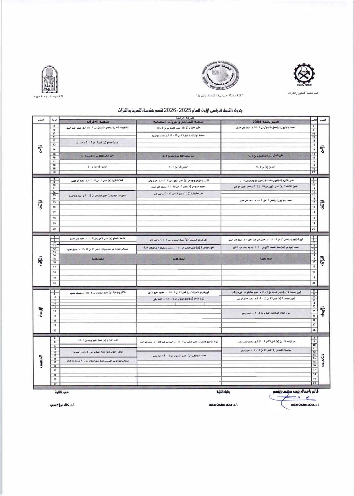 جدول قسم هندسة التعدين والفلزات الفرقة الرابعة للفصل الدراسي الأول للعام الجامعي 2025-2026م