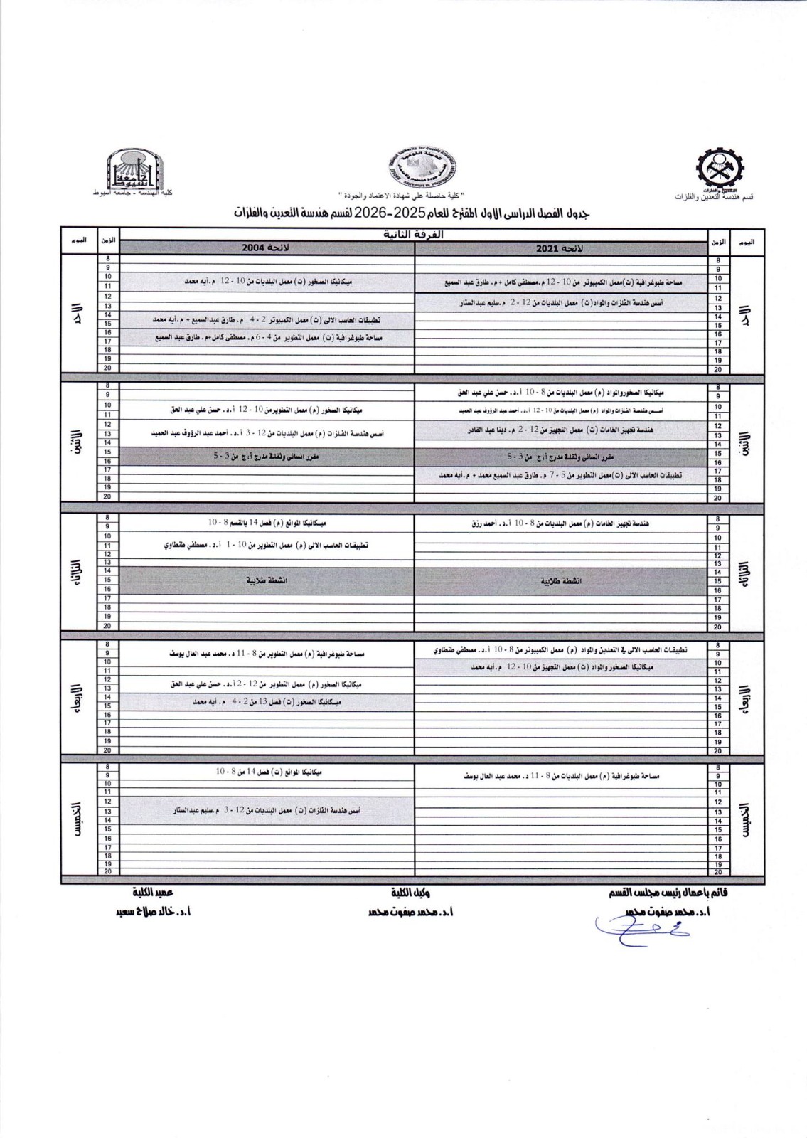 جدول قسم هندسة التعدين والفلزات الفرقة الثانية للفصل الدراسي الأول للعام الجامعي 2025-2026م