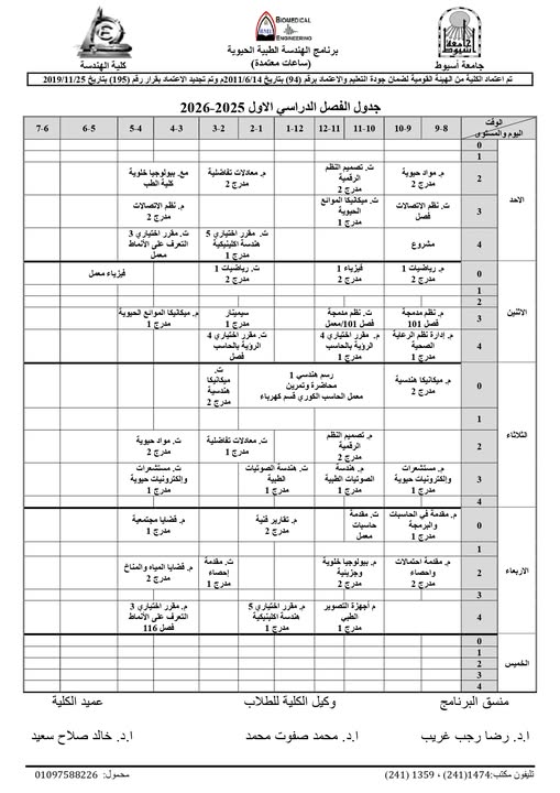 جدول برنامج الهندسة الطبية الحيوية ساعات معتمدة للفصل الدراسي الأول للعام الجامعي 2025/2026م