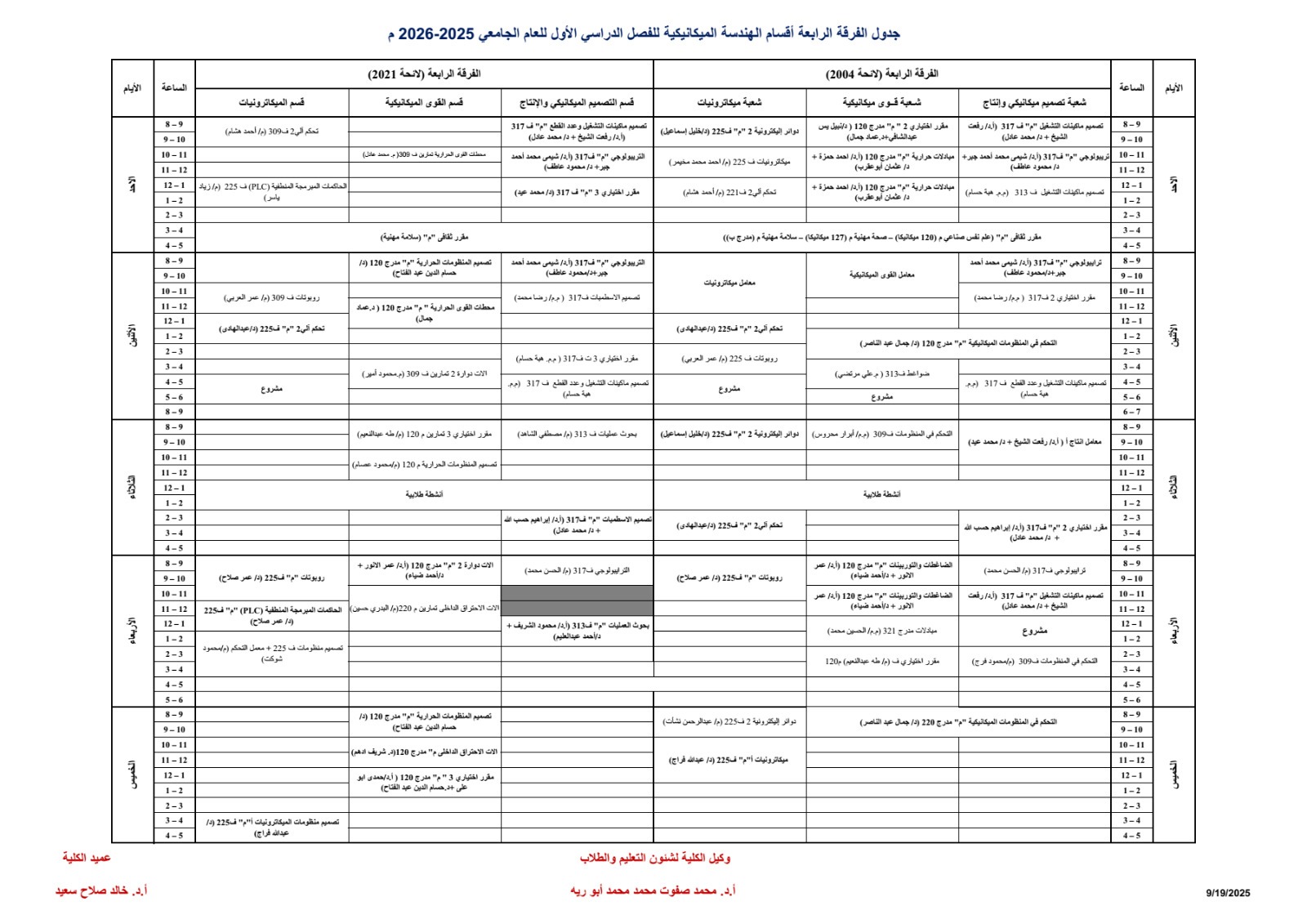 جدول الفرقة الرابعة أقسام الهندسة الميكانيكية للفصل الدراسي الأول للعام الجامعي 2025/2026م