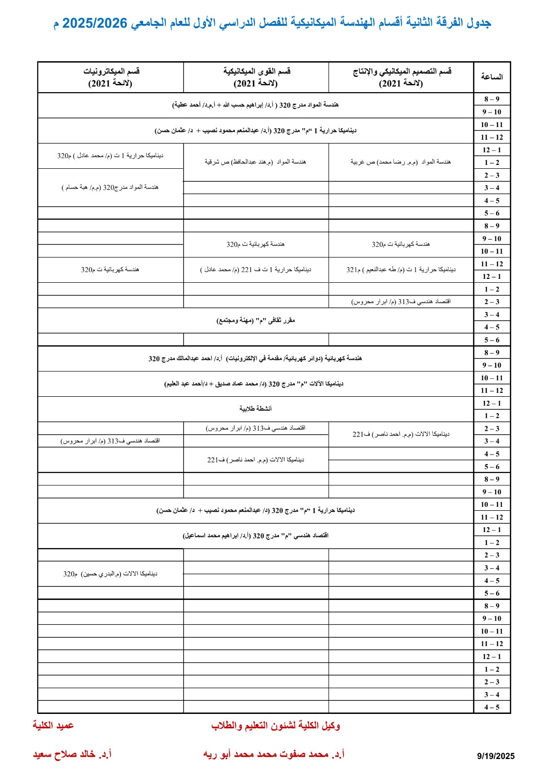 جدول الفرقة الثانية أقسام الهندسة الميكانيكية للفصل الدراسي الأول للعام الجامعي 2025/2026م
