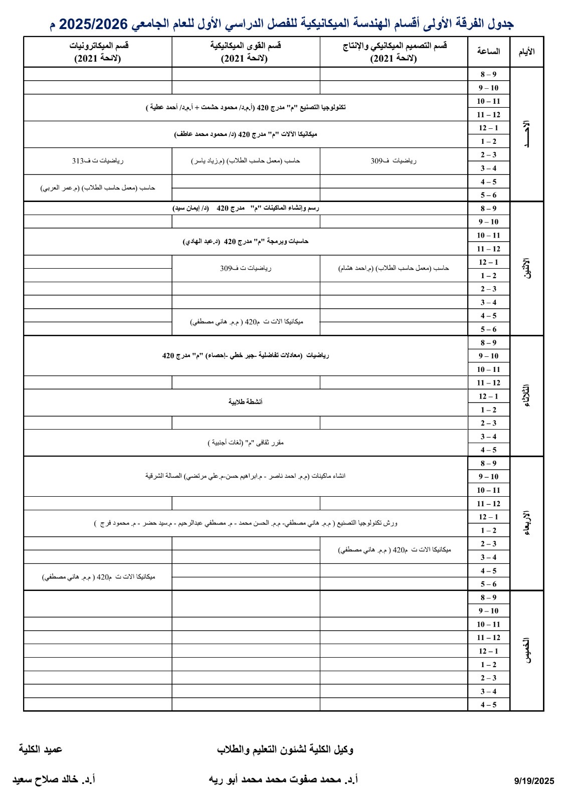 جدول الفرقة الأولى أقسام الهندسة الميكانيكية للفصل الدراسي الأول للعام الجامعي 2025/2026م