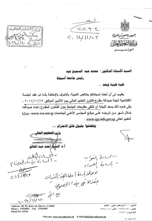 تم عقد الجلسة الإفتتاحية للجنة صياغة مقترح قانون التعليم العالى يوم الأثنين الموافق 17/11/2014وفى ضوء ذلك يسعد اللجنة أن تتلقى مقترحات الجامعة حول القانون المقترح إعداد صياغتة خلال شهر من تاريخة على موقع المجلس الأعلى للجامعات .
