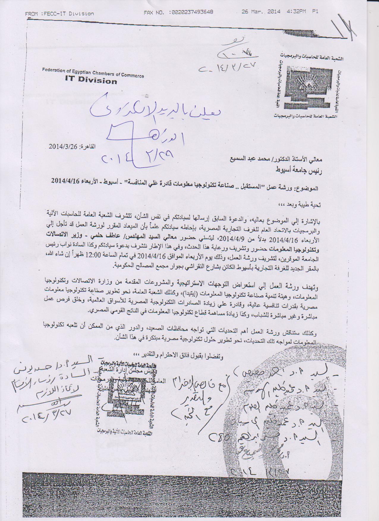 تم تأجيل ورشة عمل المستقبل ..صناعة تكنولوجيا المعلومات قادرة على المنافسة - أسيوط الى يوم الأربعاء 16/4/2014 بدلا من 9/4/2014 وذلك فى تمام الساعة 12 ظهرا ان شاء الله بالمقر الجديد بالغرفة التجارية بأسيوط الكائن بشارع النقراشى بجوار مجمع المصالح الحكومية.
