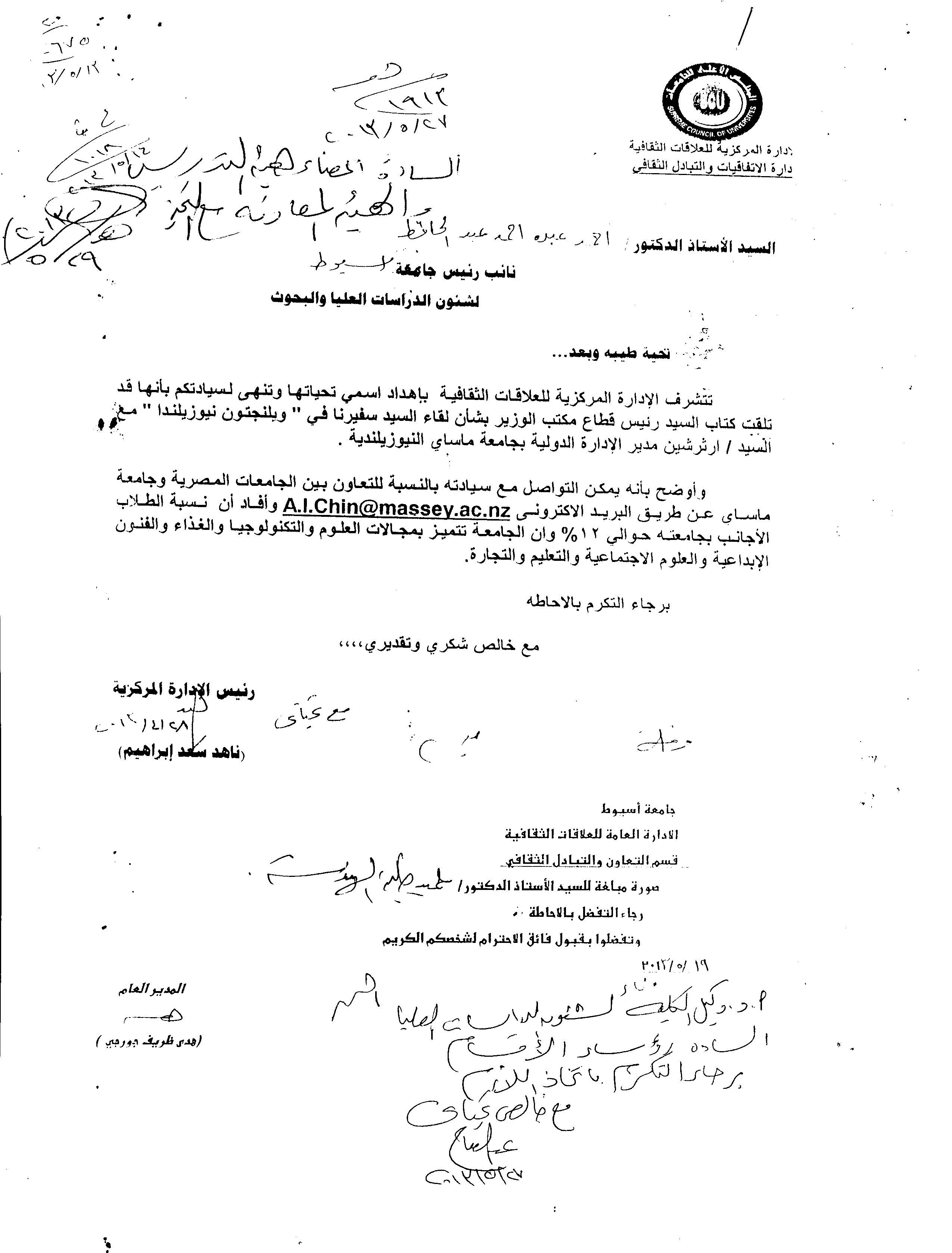 تعاون الجامعات المصرية مع جامعة ماساي النيوزيلندية 3 يونيو 2013 يمكن التواصل مع السيد / آرثر شين مدير الإدارة الدولية بجامعة ماساي النيوزيلندية عن طريق البريد الإلكتروني A.I.Chin@massey.ac.nz