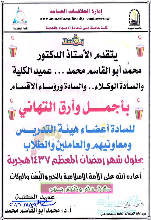 تهنئة أسرة كلية الهندسة بمناسبة حلول شهر رمضان المعظم 1437 هـ 30 مايو 2016 تهنئة أسرة كلية الهندسة بمناسبة حلول شهر رمضان المعظم 1437 هـ