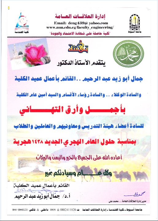 يتقدم الأستاذ الدكتور جمال أبوزيد عبدالرحيم، القائم بأعمال عميد الكلية ،والسادة الوكلاء، والسادة رؤساء الأقسام والسيد أمين عام الكلية بأجمل و أرق التهانى القلبية للسادة أعضاء هيئة التدريس ومعاونيهم والعاملين والطلاب بمناسبة حلول العام الهجرى الجديد 1473 هجرية. أعاده الله على الجميع بالخير واليمن والبركات