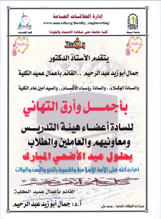 يتقدم الأستاذ الدكتورجمال أبوزيد عبدالرحيم القائم بأعمال عميد الكلية, و السادة الوكلاء ,والسادة رؤساء الأقسام بأجمل وأرق التهانى للسادة أعضاء هيئة التدريس ومعاونيهم و العاملين بحلول عيد الأضحى المبارك. أعاده الله على الأمة الإسلامية والمصرية بالخير واليمن والبركات