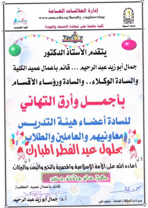 يتقدم السيد الأستاذ الدكتور/ جمال أبوزيد عبدالرحيم القائم بأعمال عميد الكلية والسادة الوكلاء والسادة رؤساء الأقسام بأجمل وأرق التهاني للسادة أعضاء هيئة التدريس ومعاونيهم والعاملين والطلاب بمناسبة حلول عيد الفطر المبارك