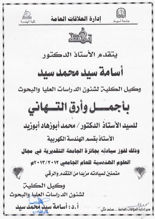 تهنئة خاصة من وكيل الكلية للدراسات العليا الدكتور/ محمد أبو زهاد الأستاذ بقسم هندسة كهرباء