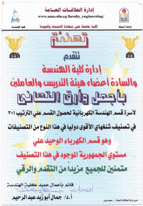 تهنئة كلية الهندسة لأسرة قسم الهندسة الكهربائية لحصول القسم على الترتيب 301 فى تصنيف شنغهاى 1 سبتمبر 2016 تهنئة كلية الهندسة لأسرة قسم الهندسة الكهربائية لحصول القسم على الترتيب 301 فى تصنيف شنغهاى