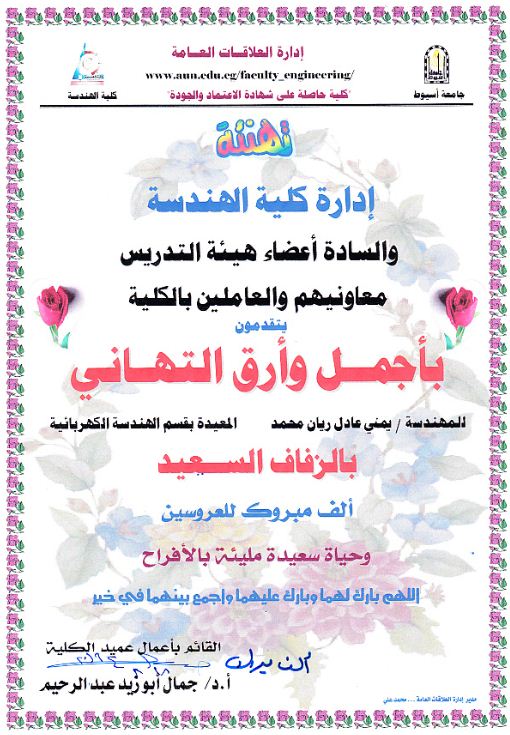 تهنئة كلية الهندسة للمهندسة/ يمنى عادل ريان المهندسة بقسم الهندسة الكهربائية بمناسبة الزفاف السعيد 29 أغسطس 2016 تهنئة كلية الهندسة للمهندسة/ يمنى عادل ريان المهندسة بقسم الهندسة الكهربائية بمناسبة الزفاف السعيد