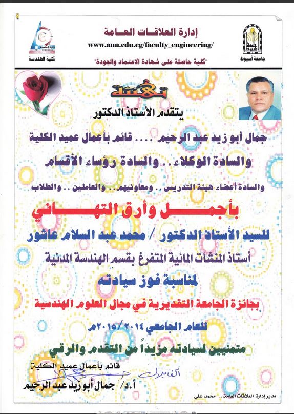 تتقدم أسرة كلية الهندسة بأرق التهاني للسيد الأستاذ الدكتور محمد عبدالسلام عاشور، أستاذ المنشآت المائية المتفرغ بقسم الهندسة المدنية، لفوز سيادته بجائزة الجامعة التقديرية فى مجال العلوم الهندسية للعام الجامعى 2014-2015 متمنيين لسيادته المزيد من التقدم والرقى