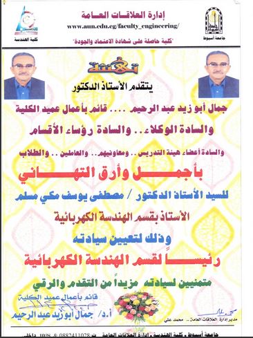 تهنئة للسيد الأستاذ الدكتور / مصطفى يوسف مكى مسلم لتعين سيادته رئيساً لقسم الهندسة الكهربائية 22 ديسمبر 2016 تهنئة للسيد الأستاذ الدكتور / مصطفى يوسف مكى مسلم لتعين سيادته رئيساً لقسم الهندسة الكهربائية