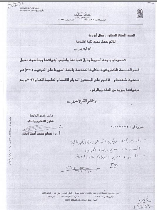 يتقدم الأستاذ الدكتور أحمد محمد عصام زناتى نائب رئيس جامعة أسيوط لشئون التعليم و الطلاب بأرق التهانى للسيد الأستاذ الدكتور جمال أبوزيد القائم بعمل عميد كلية الهندسة لحصول الكلية على المركز 301 فى تصنيف شنغهاي- الأقوى على المستوى الدولى للأقسام العلمية - لعام 2016