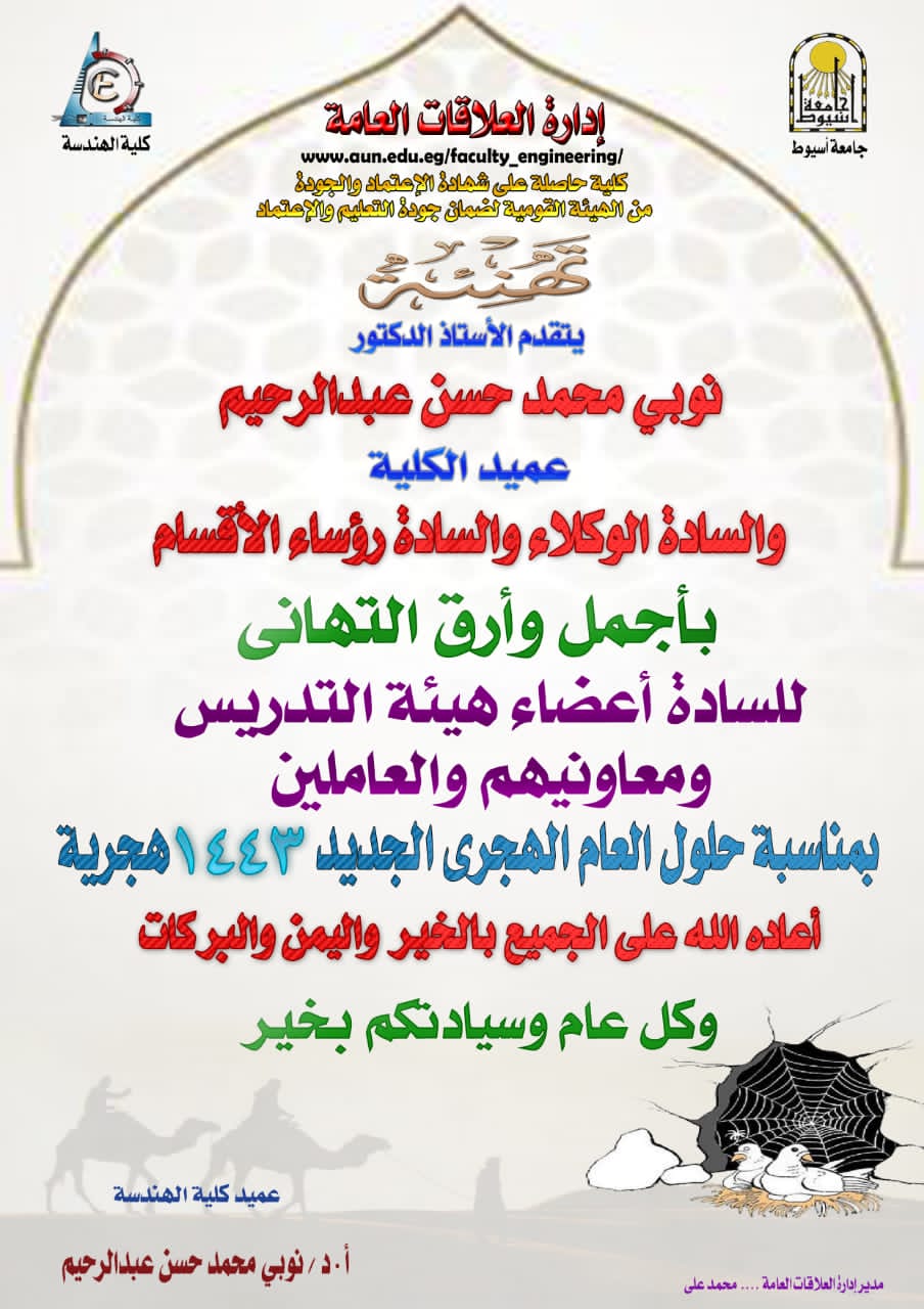 تهنئة من السيد الأستاذ الدكتور / عميد كلية الهندسة بمناسبة العام الهجري الجديد 1443
