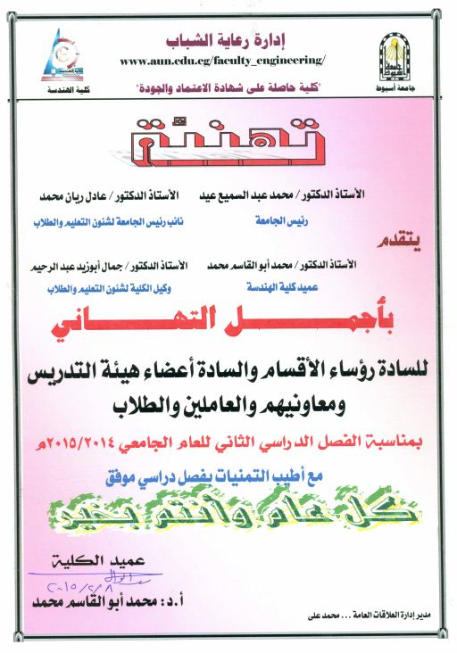تهنئة من السيد الأستاذ الدكتور / عميد كلية الهندسة بمناسبة الفصل الدراسى الثانى للعام الدراسى 2014/2015 8 فبراير 2015 يتقدم الأستاذ الدكتور/ محمد أبو القاسم محمد ....عميد الكلية بأجمل وأرق التهانى للسادة رؤساء الأقسام والسادة أعضاء هيئة التدريس ومعاونيهم والعاملين والطلاب بمناسبة الفصل الدراسى الثانى للعام الدراسى 2014/2015 مع أطيب التمنيات بفصل دراسى موفق