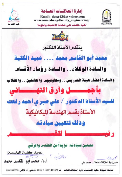 يتقدم الأستاذ الدكتور محمد ابو القاسم محمد عميد كلية الهندسةوالسادة الوكلاء والسادة رؤساء الأقسام والسادة أعضاء هيئة التدريس ومعاونيهم والعاملين والطلاب