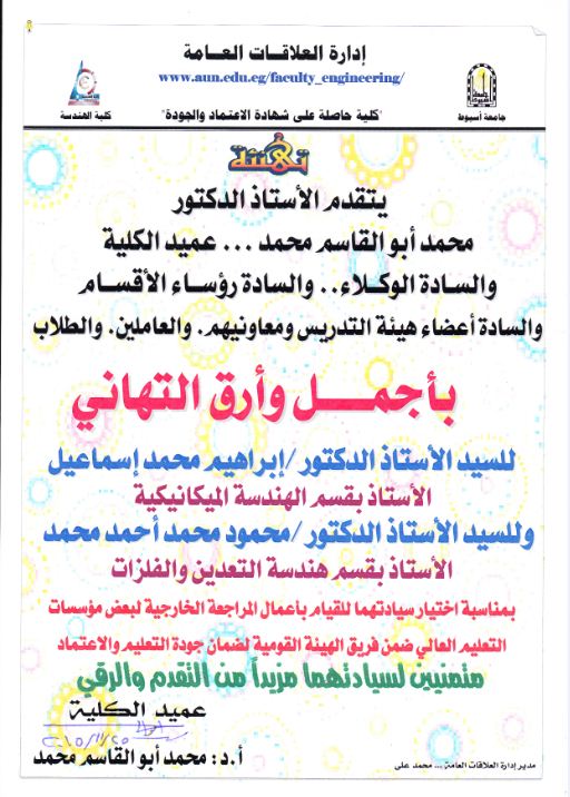 تهنئة من كلية الهندسة لكلاً من السيد الأستاذ الدكتور إبراهيم محمد إسماعيل - والسيد الأستاذ الدكتور محمود محمد احمد محمد 25 نوفمبر 2015 تهنئة من كلية الهندسة لكلاً من السيد الأستاذ الدكتور إبراهيم محمد إسماعيل - والسيد الأستاذ الدكتور محمود محمد احمد محمد