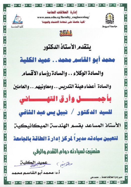 لتعيين سيادته مديراً لمركز إدارة الطاقة بالجامعة