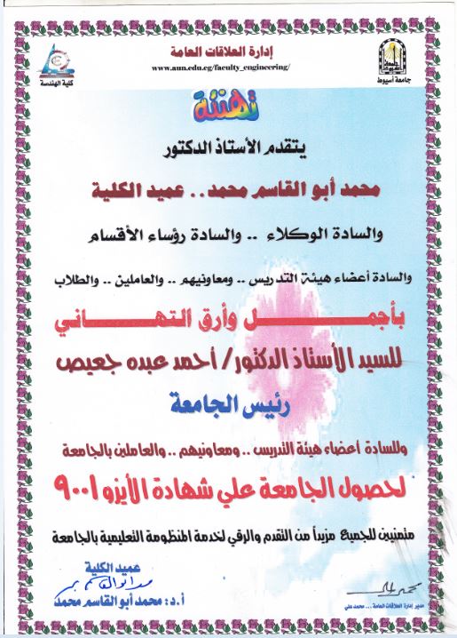 تهنئة من عميد كلية الهندسة بمناسبة حصول جامعة أسيوط على شهادة الأيزو 9001 13 مارس 2016 تهنئة من عميد كلية الهندسة بمناسبة حصول جامعة أسيوط على شهادة الأيزو 9001
