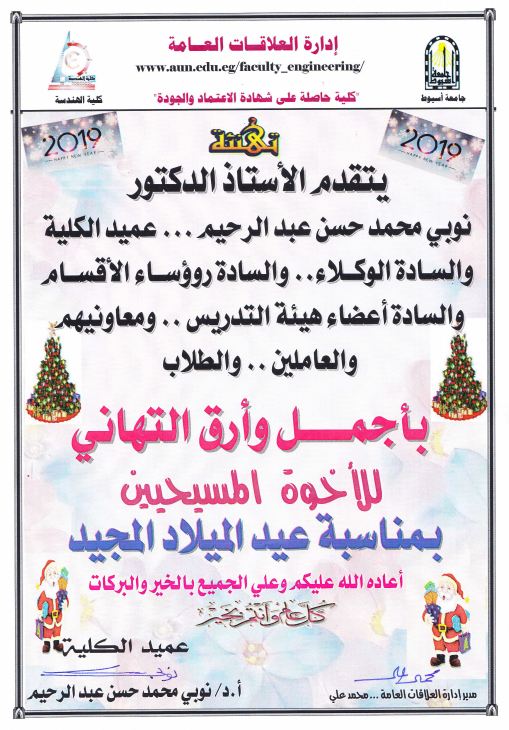 تهنئة من عميد كلية بمناسبة عيد الميلاد المجيد 31 ديسمبر 2018 تهنئة من عميد كلية بمناسبة عيد الميلاد المجيد