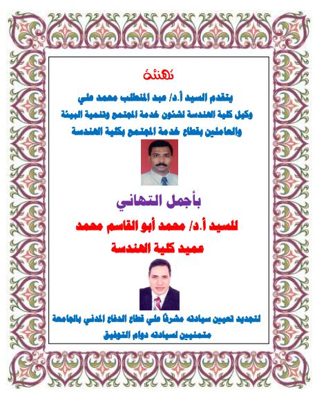 تهنئة من قطاع خدمة المجتمع وتنمية البيئة بكلية الهندسة الي أ.د محمد أبو القاسم - عميد الكلية 21 يناير 2016 تهنئة من قطاع خدمة المجتمع وتنمية البيئة بكلية الهندسة الي أ.د محمد أبو القاسم - عميد الكلية
