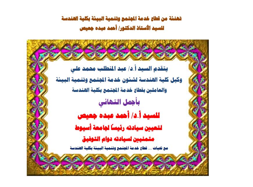 تهنئة من قطاع خدمة المجتمع وتنمية البيئة بكلية الهندسة للسيد أ.د/ أحمد عبده جعيص 6 يناير 2016 تهنئة من قطاع خدمة المجتمع وتنمية البيئة بكلية الهندسة للسيد أ.د/ أحمد عبده جعيص