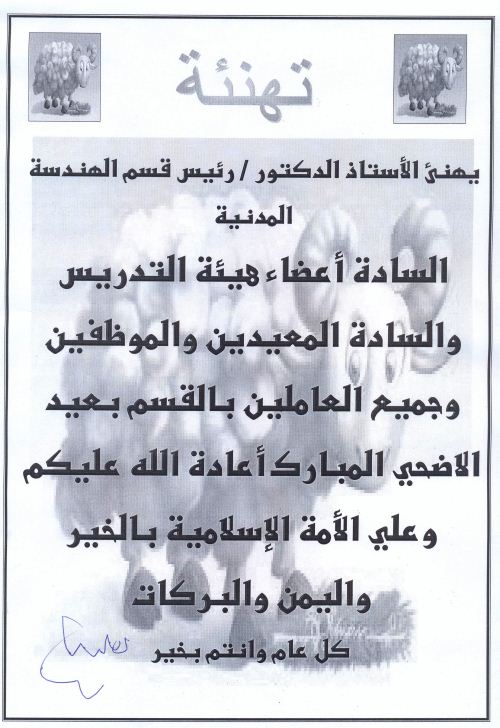 تهنئة من رئيس قسم الهندسة المدنية الى السادة أعضاء هيئة التدريس بمناسبة عيد الأضحى المبارك