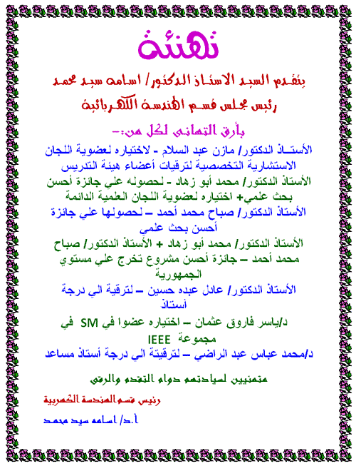 تهنئة مقدمة من أ.د/ أسامة سيد محمد رئيس قسم كهرباء لعدد من الأساتذة 14 فبراير 2013 تهنئة مقدمة من أ.د/ أسامة سيد محمد رئيس قسم كهرباء لعدد من الأساتذة