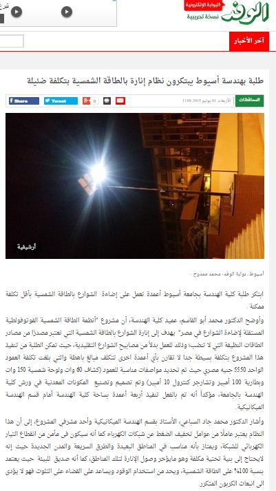 طلبة بهندسة أسيوط يبتكرون نظام إنارة بالطاقة الشمسية بتكلفة ضئيلةابتكر طلبة كلية الهندسة بجامعة أسيوط أعمدة تعمل على إضاءة الشوارع بالطاقة الشمسية بأقل تكلفة ممكنة .وأوضح الدكتور محمد أبو القاسم، عميد كلية الهندسة، أن مشروع "أنظمة الطاقة الشمسية الفوتوفولطية المستقلة لإضاءة الشوارع في مصر" يهدف إلى إنارة الشوارع بالطاقة الشمسية التي تعتبر مصدرًا من مصادر الطاقات النظيفة التي لا تنضب؛ وذلك للعمل بدلاً من مصابيح الشوارع التقليدية، حيث تمكن الطلبة من تنفيذ هذا المشروع بتكلفة بسيطة جدا لا تقارن بأي أعمدة اخرى تتكلف مبالغ باهظة والتي بلغت تكلفة العمود الواحد 5550 جنيه مصري حيث تم تحديد مواصفات مناسبة للعمود (كشاف 60 وات ولوحة شمسية 150 وات وبطارية 100 أمبير وتشارجر كنترول 10 أمبير) وتم تصميم وتصنيع المكونات المعدنية في ورش كلية الهندسة بالجامعة، مؤكداً أنه تم بالفعل تنفيذ أربعة أعمدة بساحة كلية الهندسة أمام قسم الهندسة الميكانيكية.وأشار الدكتور محمد جاد السباعي، الأستاذ بقسم الهندسة الميكانيكية وأحد مشرفي المشروع، إلى أن هذا النظام يعتبر عاملًا من عوامل تخفيف الضغط عن شبكات الكهرباء كما أنه سيكون فى مأمن من انقطاع التيار الكهربائي للشبكة، ويمتاز بأنه مناسب في المناطق البعيدة والطرق السريعة والمدن الجديدة حيث إنه لايحتاج إلى بنية تحتية مكلفة وهو مايؤخر وصول الإنارة لتلك المناطق، كما أنه صديق للبيئة حيث يعتمد بنسبة 100% على الطاقة الشمسية، ويحد من استخدام الوقود ويساعد على القضاء على التلوث فهو لا يؤدى الى انبعاث الكربون المتكرر.