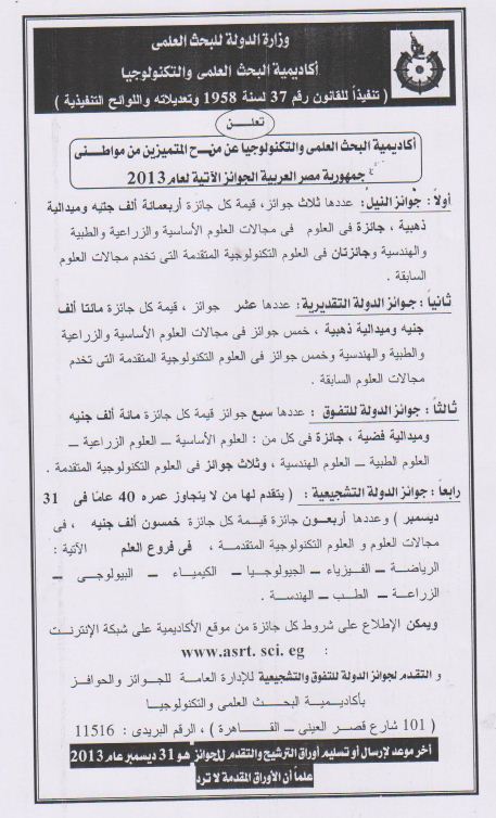 والتقدم لجوائز الدولة للتفوق والتشجيعية للإدارة العامة للجوائز والحوافز بأكاديمية البحث العلمى والتكنولجيا