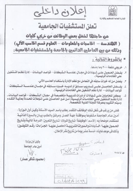تعلن المستشفيات الجامعية عن حاجتها لشغل بعض الوظائف 8 أبريل 2015 تعلن المستشفيات الجامعية عن حاجتها لشغل بعض الوظائف