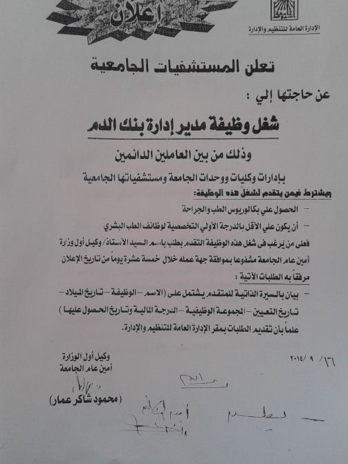 تعلن المستشفيات الجامعية عن حاجتها لشغل وظيفة مدير ادارة بنك الدم 18 سبتمبر 2014 تعلن المستشفيات الجامعية عن حاجتها لشغل وظيفة مدير ادارة بنك الدم وذلك من بين العاملين الدائمين بادارات ووحدات الجامعة ومتشفياتها الجامعية