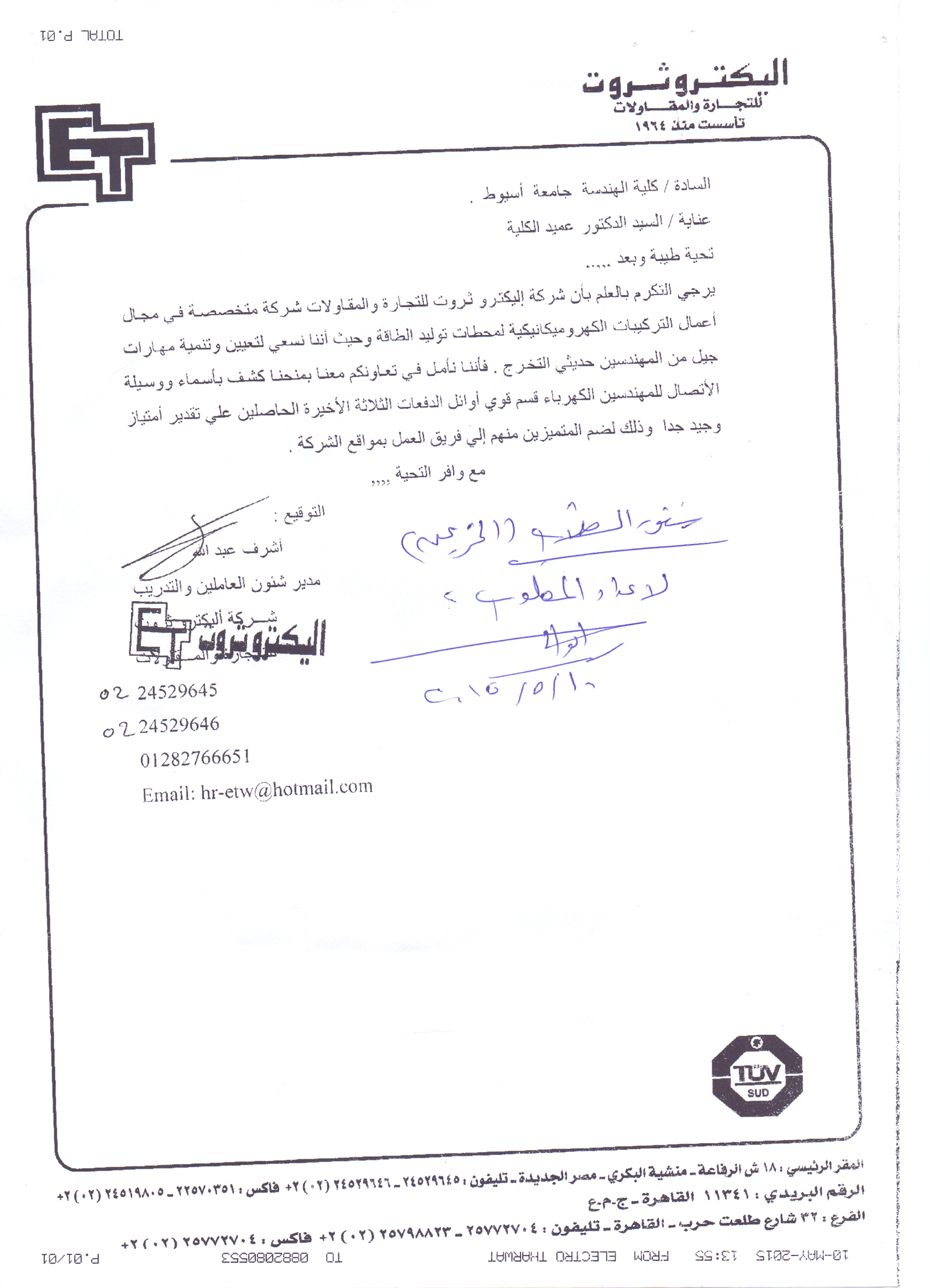 تعلن شركة الكتروثروت للتجارة والمقاولات ، شركة متخصصة في مجال أعمال التركيبات الكهروميكانيكية لمحطات توليد الطاقة ، عن رغبتها في تعيين عدد من أوائل خريجين قسم كهرباء شعبة قوى من الدفعات الثلاث الأخيرة من الحاصلين على تقدير امتياز وجيد جدا وضم المتميزين منهم إلى فريق العمل بالشركة.
