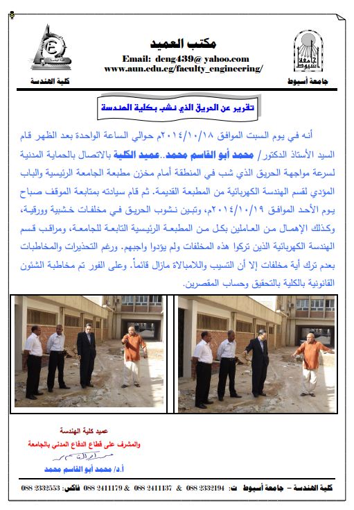 أنـه فـي یـوم الـسبت الموافـق ٢٠١٤/١٠/١٨م حـوالي الـساعة الواحـدة بعـد الظهـر قـام السید الأستاذ الـدكتور/ محمد أبو القاسم محمد..عميد الكلية بالاتـصال بالحمایـة المدنیـة لـسرعة مواجهـة الحریـق الـذي شـب فـي المنطقـة أمـام مخـزن مطبعـة الجامعـة الرئیـسیة والبـاب المؤدي لقسم الهندسة الكهربائیة من المطبعـة القدیمـة. ثـم قـام سـیادته بمتابعـة الموقـف صـباح یــوم الأحــد الموافــق ٢٠١٤/١٠/١٩م، وتبــین نــشوب الحریــق فــي مخلفــات خــشبیة وورقیــة، وكــذلك الإهمــال مــن العــاملین بكــل مــن المطبعــة الرئیــسیة التابعــة للجامعــة، ومراقــب قــسم الهندسة الكهربائیة الذین تركوا هذه المخلفات ولم یؤدوا واجبهم. ورغم التحذیرات والمخاطبـات بعدم ترك أیة مخلفات إلا أن التسیب واللامبالاة مازال قائماً. وعلى الفور تم مخاطبـة الـشئون القانونیة بالكلیة بالتحقیق وحساب المقصرین.