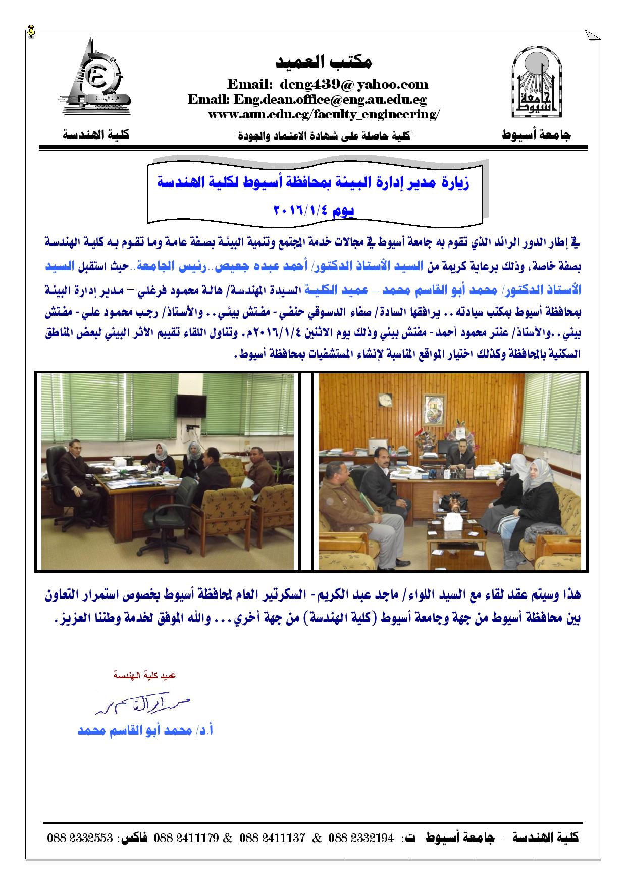 تقرير عن زيارة مدير إدارة البيئة بمحافظة أسيوط لكلية الهندسة يوم 4-1-2016 5 يناير 2016 تقرير عن زيارة مدير إدارة البيئة بمحافظة أسيوط لكلية الهندسة يوم 4-1-2016