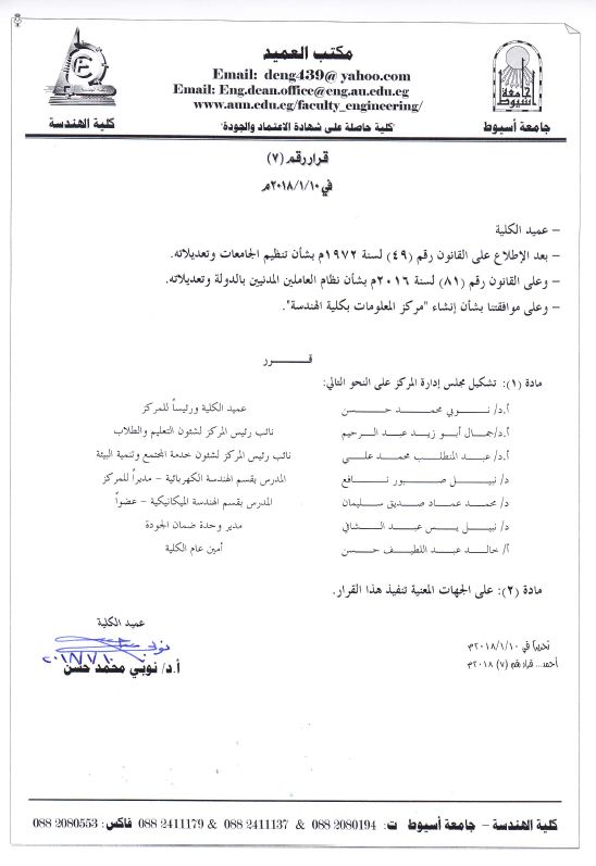 تشكيل لجنة مركز المعلومات بكلية الهندسة جامة أسيوط 7 فبراير 2018 تشكيل لجنة مركز المعلومات بكلية الهندسة جامة أسيوط