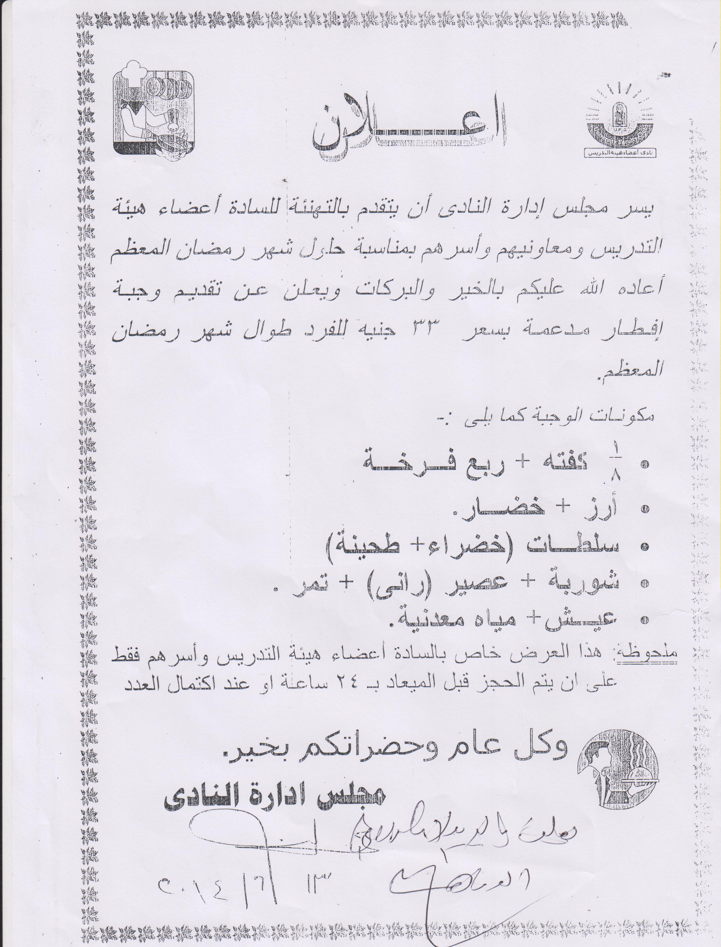 وجبة افطار مدعمة من نادى أعضاء هيئة التدريس 24 يونيو 2014 يعلن نادى أعضاء هيئة التدريس ومعاونيهم وأسرهم بمناسبة حلول شهر رمضان المعظم اعاده الله عليكم بالخير والبركات ويعلن عن تقديم وجبة إفطار مدعمة بسعر 33جنيه للفرد طوال شهر رمضان المعظم.
