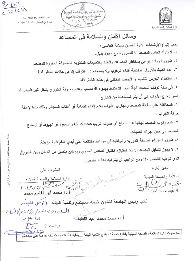 وسائل الأمان والسلامة فى المصاعد 12 فبراير 2018 يجب إتباع الإرشادات الأتية لضمان سلامة العاملين: -لا يترك العامل المصعد الا للضرورة مع وجود بديل - ضرورة زيادة الوعى بمخاطر المصاعد والتقيد بالتعليمات المكتوبة كالحمولة المقررة للمصعد