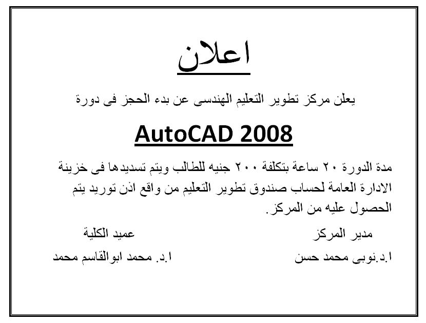 يعلن مركز التطوير بكلية الهندسة عن دورة AutoCAD 2008 19 مايو 2015 يعلن مركز تطوير التعليم الهندسى عن بدء الحجز فى دورة AutoCAD 2008 مدة الدورة 20 ساعة بتكلفة 200 جنيه للطالب ويتم تسديدها فى خزينة الادارة العامة لحساب صندوق تطوير التعليم من واقع اذن توريد يتم الحصول عليه من المركز.