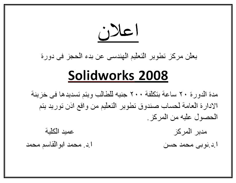 يعلن مركز تطوير التعليم الهندسى عن بدء الحجز فى دورة Solidworks 2008 19 مايو 2015 مدة الدورة 20 ساعة بتكلفة 200 جنيه للطالب ويتم تسديدها فى خزينة الادارة العامة لحساب صندوق تطوير التعليم من واقع اذن توريد يتم الحصول عليه من المركز.